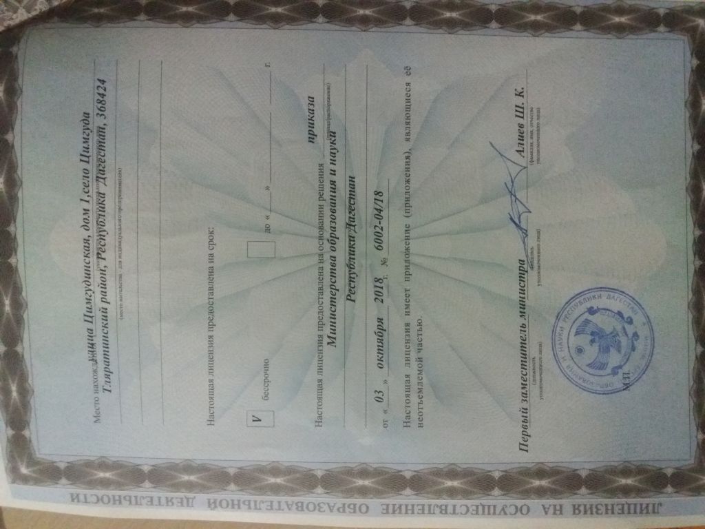 | Адрес местонахождения образовательной организации* | 368060, Республика Дагестан, п/о Бабаюрт, Бабаюртовский район, СПК Победа Тляратинского района, ул. Цимгудинская дом №1 |