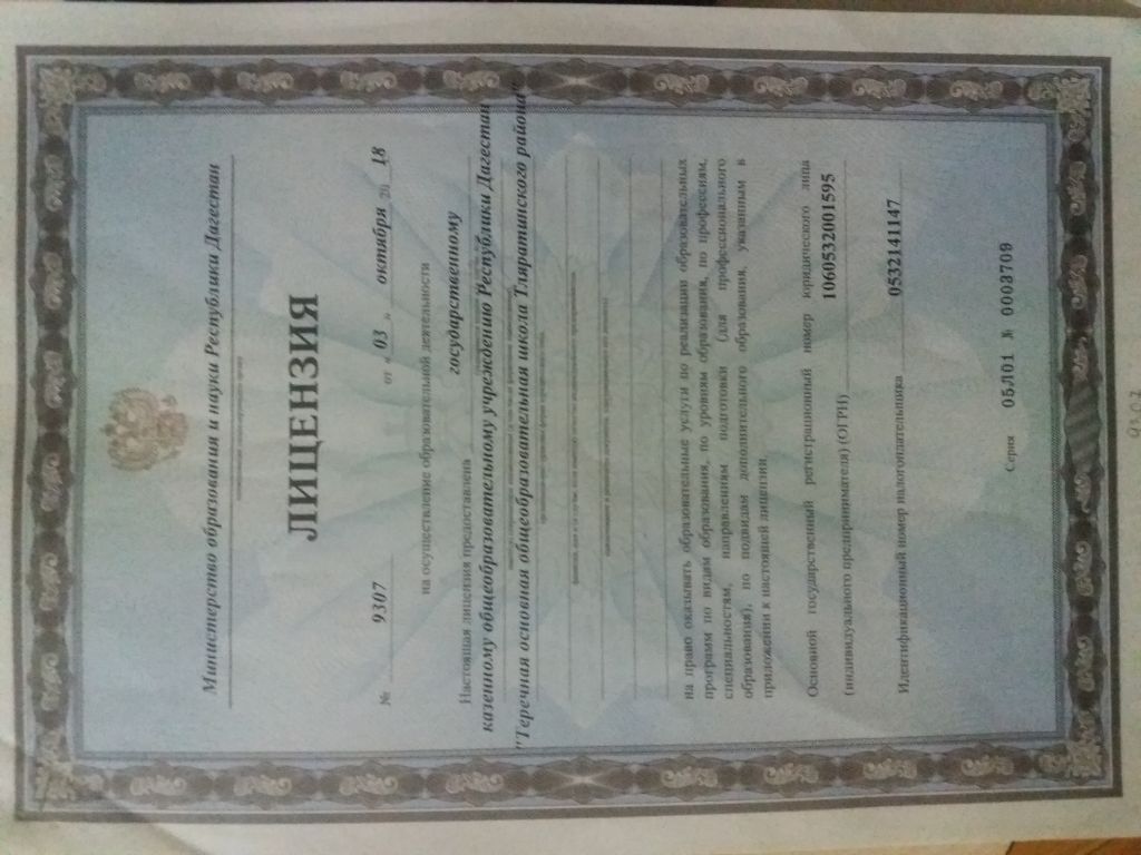 | Полное наименование образовательной организации* | Государственное казенное общеобразовательное учреждение Республики Дагестан "Теречная основная общеобразовательная школа Тляратинского Района" |